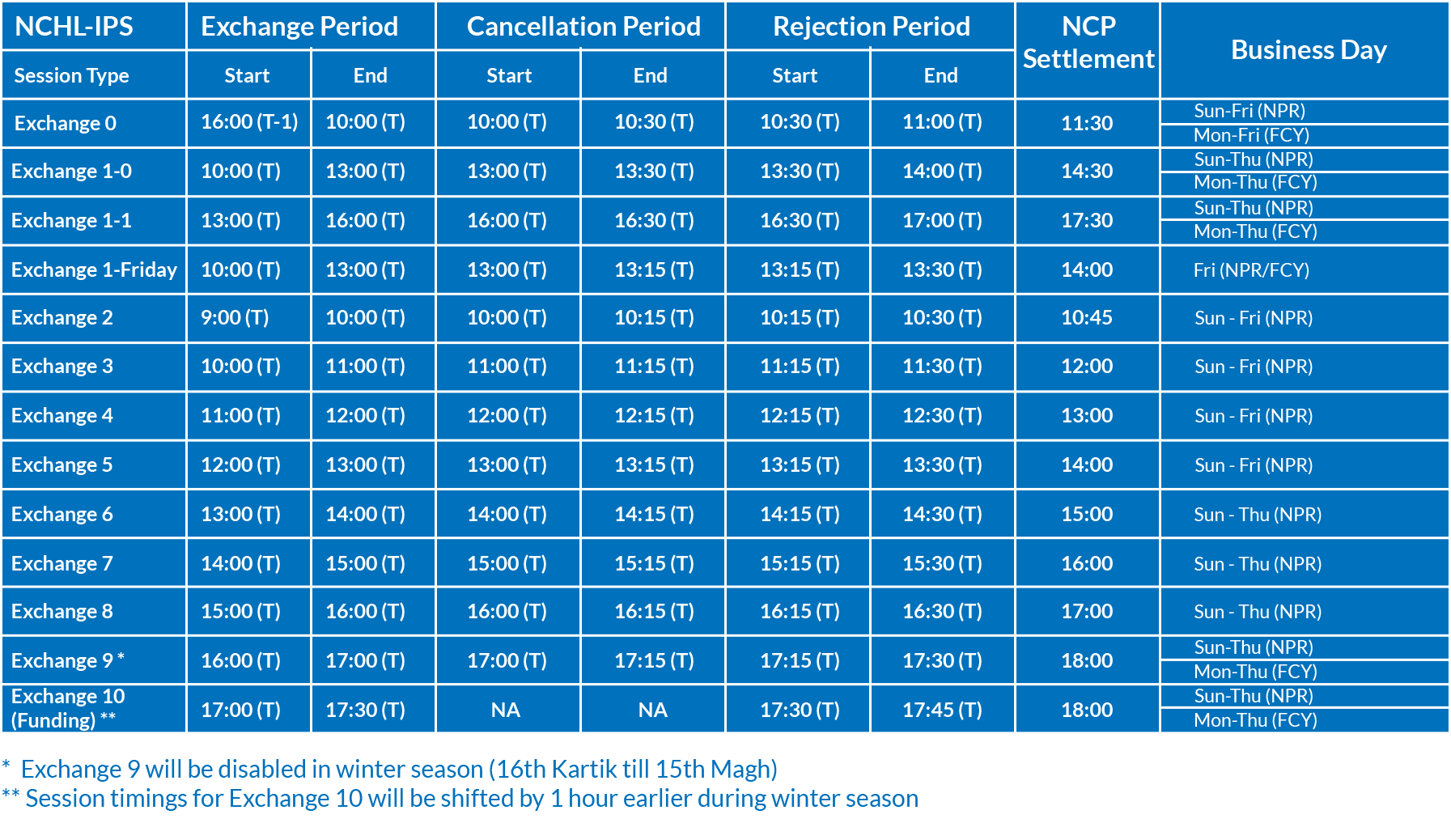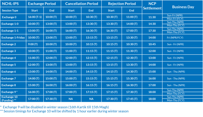 NCHL-IPS is a system for clearing large number of transactions that provides a mechanism for the participating members to safely and efficiently transfer funds from one account to any other account held at any of the participating member banks & financial institutions (BFIs) on behalf of their customers and for their own purposes. It supports account to account payments (direct credit) and collection (direct debit) related transactions on deferred net settlement basis. Such transactions could be one-to-one, recurring or bulk (up to 10,000 transactions) in a single batch. The underlying transaction could be for various purposes defined as products. Exchange sessions are mapped to the NCHL-IPS products (purposes) and are automatically presented to the earliest available exchange session.